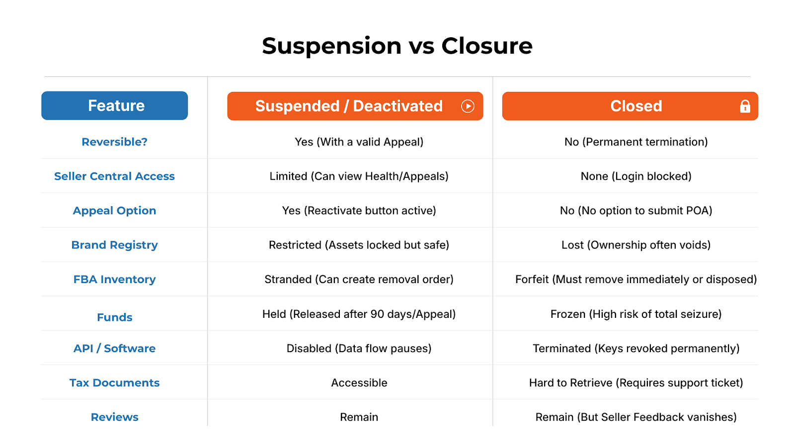 1. Amazon Account Suspended vs Closed — The Core Differences
